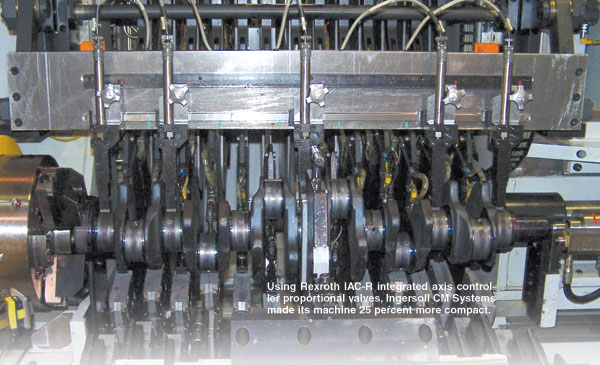 Previously, Ingersoll's rolling machines used separate control cards for each of the 13 axes of motion, which meant a larger processing area on the machine, expansive cabinet space for individual controllers, and excessive wiring for components and I/O. But as crankshafts have become more compact, Ingersoll wanted its next generation of crankshaft rolling machines to be more compact. Ingersoll, which has a longstanding relationship with Bosch Rexroth Corporation, called upon the company's Hydraulics and Electric Drives and Controls technology groups to provide an innovative control solution that would help them satisfy industry demands for greater crankshaft strength and precision as well as faster crankshaft production. Ingersoll used Rexroth's IAC-R Integrated Axis Controller proportional valves with integrated motion control on the hydraulic axes and combined them with a Rexroth IndraMotion MTX controller to achieve a design 25 percent more compact. The new design not only produces the crankshaft strength and precision Ingersoll's customers demand, but also saves space on the factory floor.