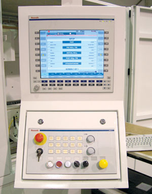 The overall machine is controlled with the MTX CNC controller. The performance CNC card running the CNC motion and all machine logic is installed in a Bosch Rexroth IPC40 located in the main electrical enclosure. A single cable connects the 15" display panel in the operator console, providing keyboard, machine key, USB, and mouse functionality. This installation offers a lightweight, rugged and slim operator console. In addition, the Rexroth IndraWorks software package used with the MTX controller offers all the tools necessary to engineer, commission, and operate the machine. The operator interface can easily adapt to fit the machine and operator needs using an integrated WinStudio custom screen editor.