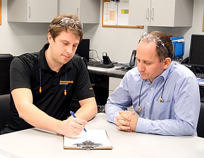Narcis Georgescu, Senior Quality Supervisor at Linex Manufacturing (right) consults with Renishaw applications engineer Brad Linscott. [All photos courtesy Renishaw]