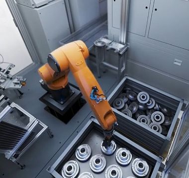 Bin picking, or "reaching into the box," is a technology in which a robotic arm uses a 3D sensor system (3D camera, scanner, etc.) to remove workpieces in a chaotic position from a mesh box or similar. The automation then correctly aligns the parts and feeds them to the next processing step. This can be, for example, the loading of an EMAG pick-up lathe. Bin picking is ideal for automated handling of workpieces such as saw cuttings or forged parts in chaotic feed or when high flexibility is required.