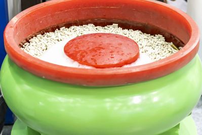 A vibratory polishing machine filled with stone or ceramic abrasive media.