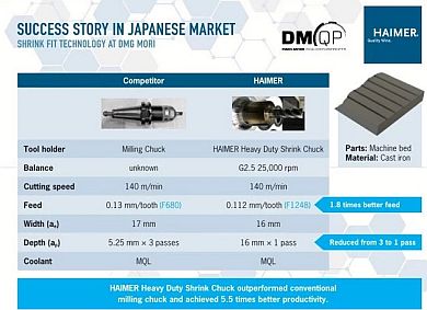 DMG MORI also successfully replaced milling chucks with HAIMER shrink fit holders seeing significant productivity increases of up to 5.5 times.
