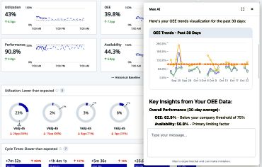 For example, Max AI's Continuous Improvement Agent pinpoints production bottlenecks, uncovers setup trends, and delivers shift reports that empower your team with real-time insights while automating routine tasks.