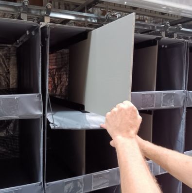 The Dyna-Pick system features rugged industrial canvas panels that suspend below standard pallet rack beams, creating two rows of hanging bins in what would be floor-level rack space. What sets Dyna-Pick apart is its proprietary quick-connect bracket, which mounts inside the rack beam -- not over it -- eliminating snag points and allowing seamless clip-on installation.