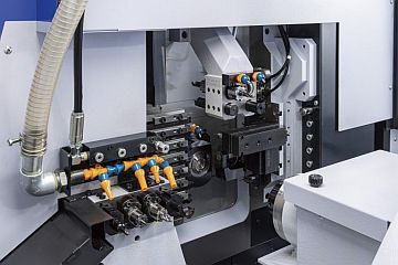 This compact solution can effectively machine material up to 1-inch in diameter. Its unique design features a gate-shaped tool post that encircles the guide bush for precise front-side machining. This setup is robustly equipped with 8 turning tools, a 5-position sleeve holder, and a 7-spindle power-driven tool unit offering 5 modular cartridge positions. The wide range of available modular units, including Cross Drilling, Front Drilling, Slotting, Thread Whirling, and Polygon Machining, significantly enhances the machine's overall versatility and range of machining options.